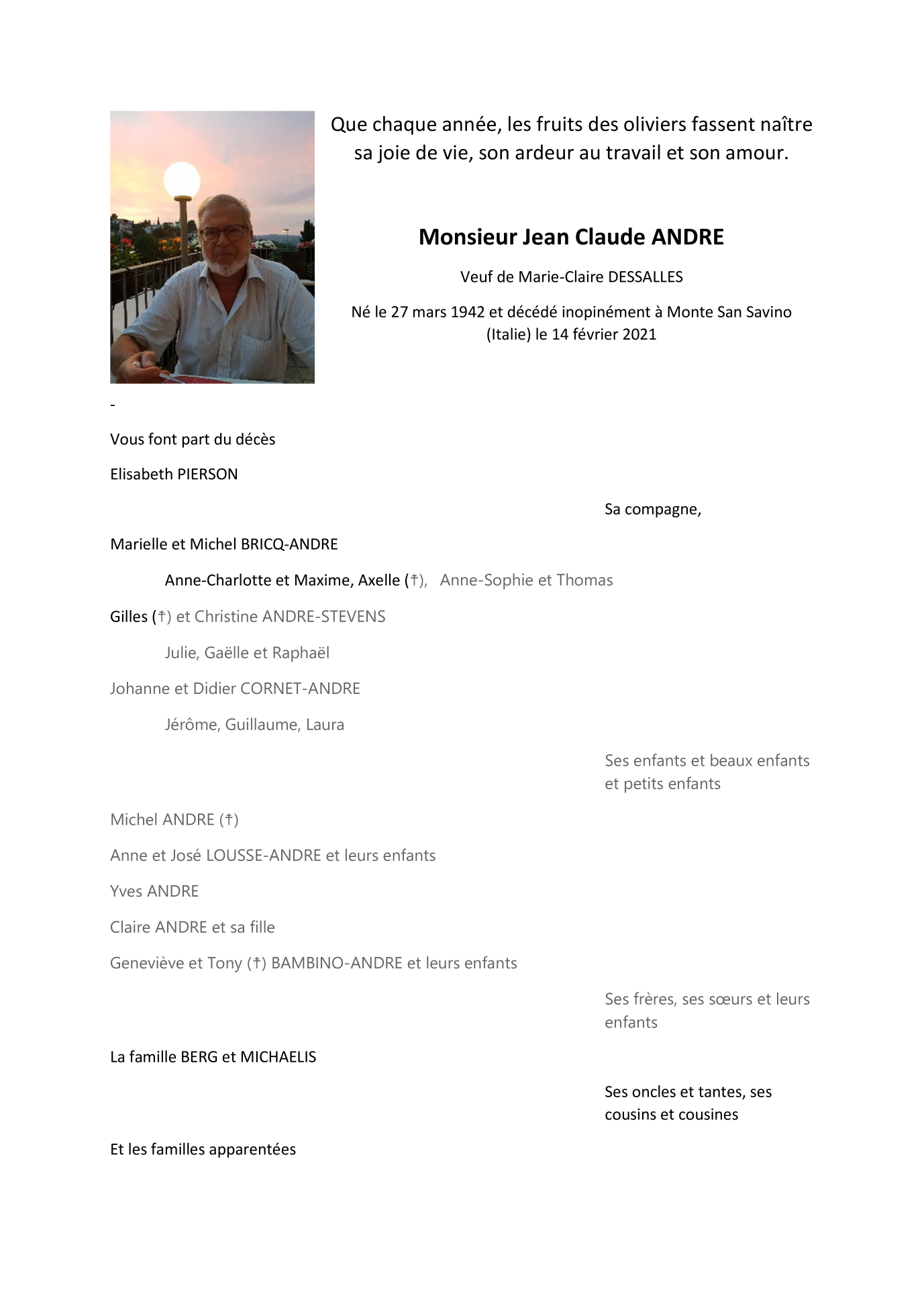 Fallecido en Monte San Savino (52048, Italia) el domingo, 14 de febrero de 2021 a la edad de 78 años