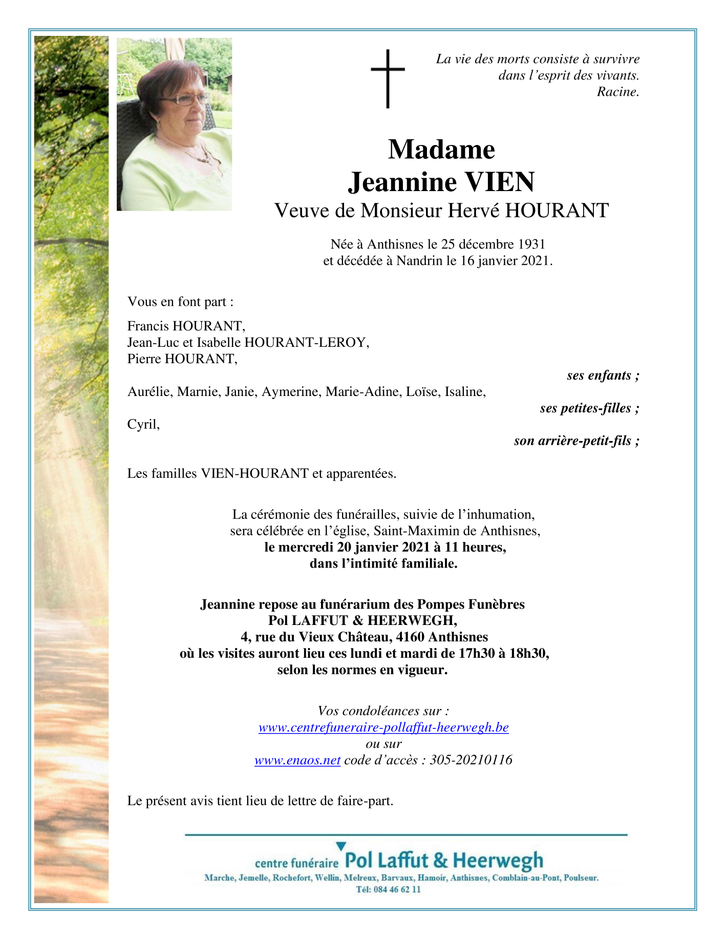 Overleden te Nandrin (4550) op zaterdag 16 januari 2021 op 89-jarige leeftijd