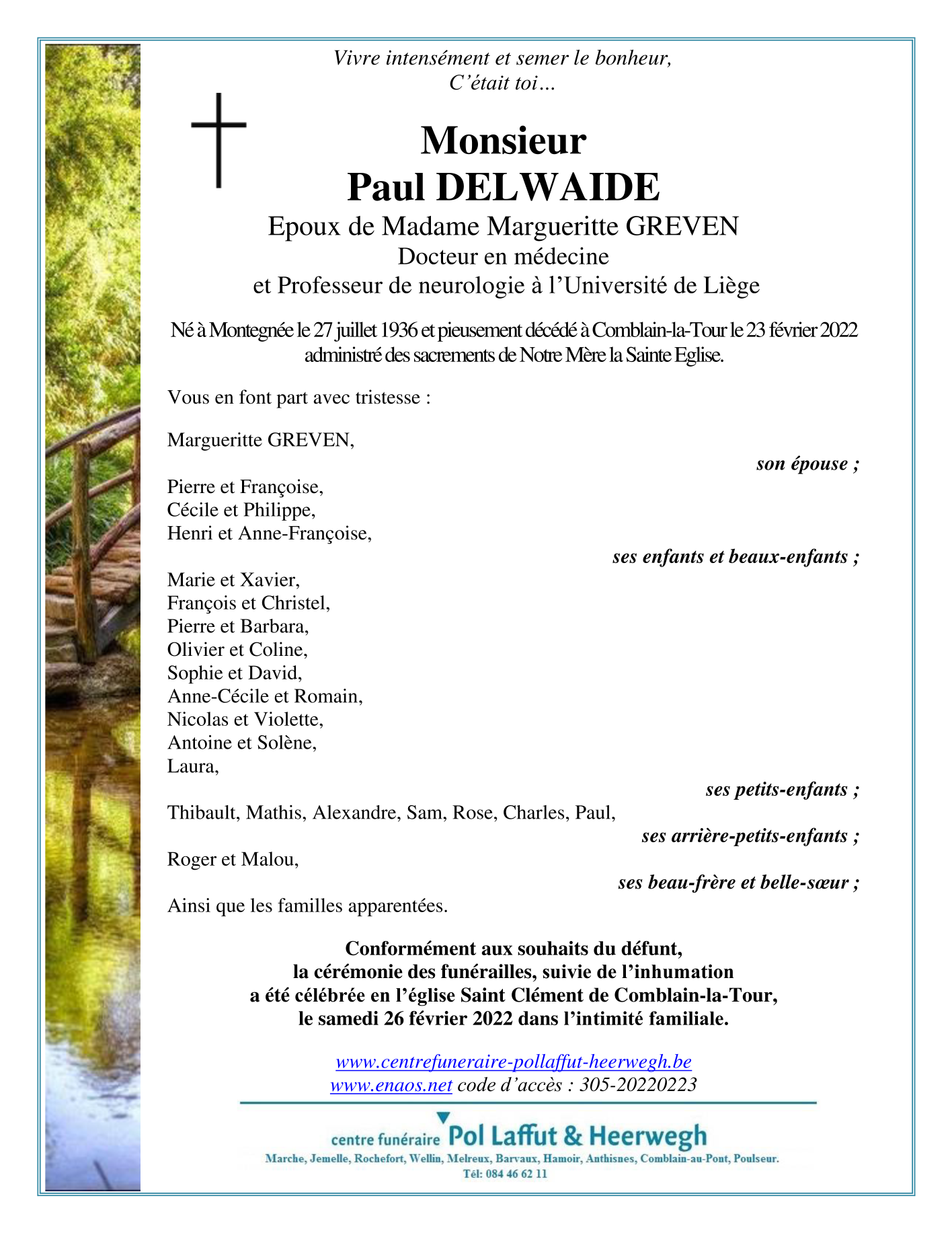 Décédé à Comblain-la-Tour (4180) le mercredi 23 février 2022 à l'âge de 85 ans