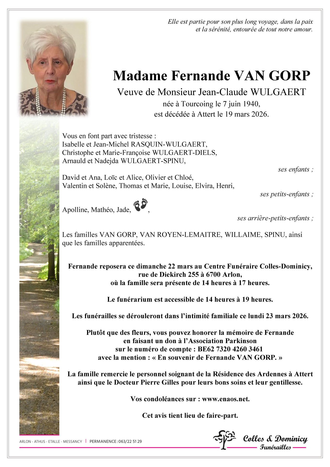 Weduwe van Monsieur Jean-Claude WULGAERT