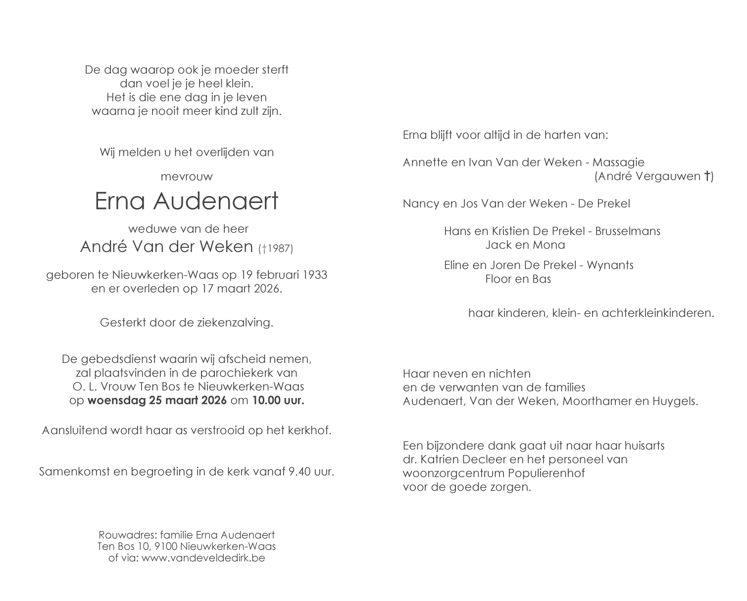 Décédée à Nieuwkerken-Waas (9100) le mardi 17 mars 2026 à l'âge de 93 ans