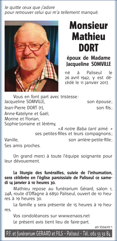 Overleden te Paliseul (6850) op woensdag 11 januari 2017 op 74-jarige leeftijd