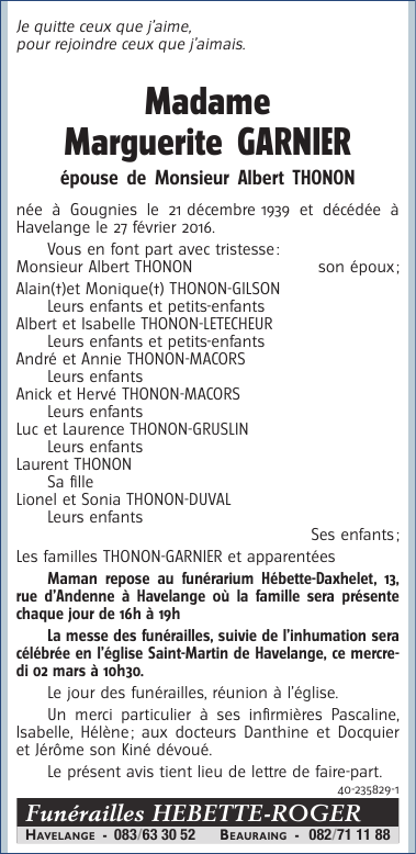Décédée à Havelange (5370) le samedi 27 février 2016 à l'âge de 76 ans