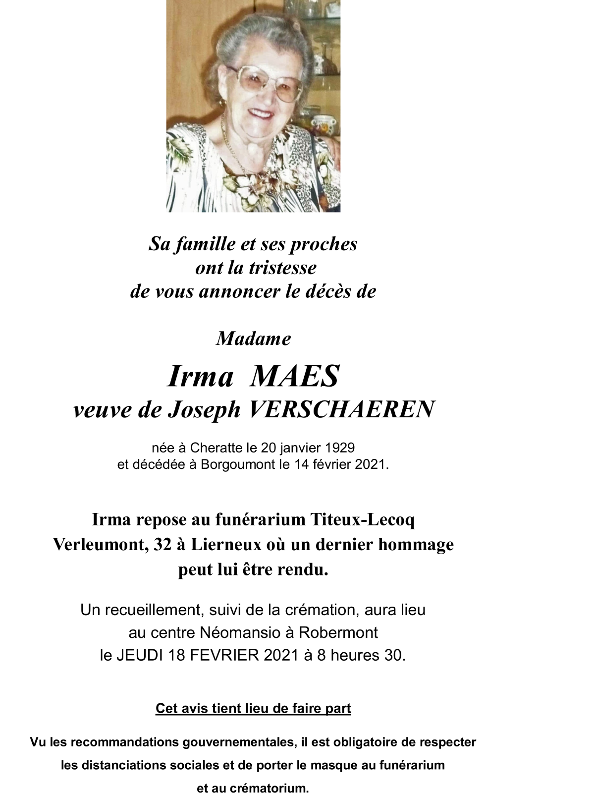 Décédée à Borgoumont (4987) le dimanche 14 février 2021 à l'âge de 92 ans