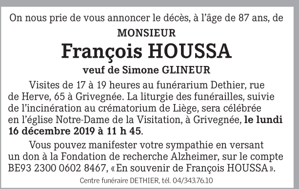 Décédé à Embourg (4053) le mercredi 11 décembre 2019 à l'âge de 87 ans