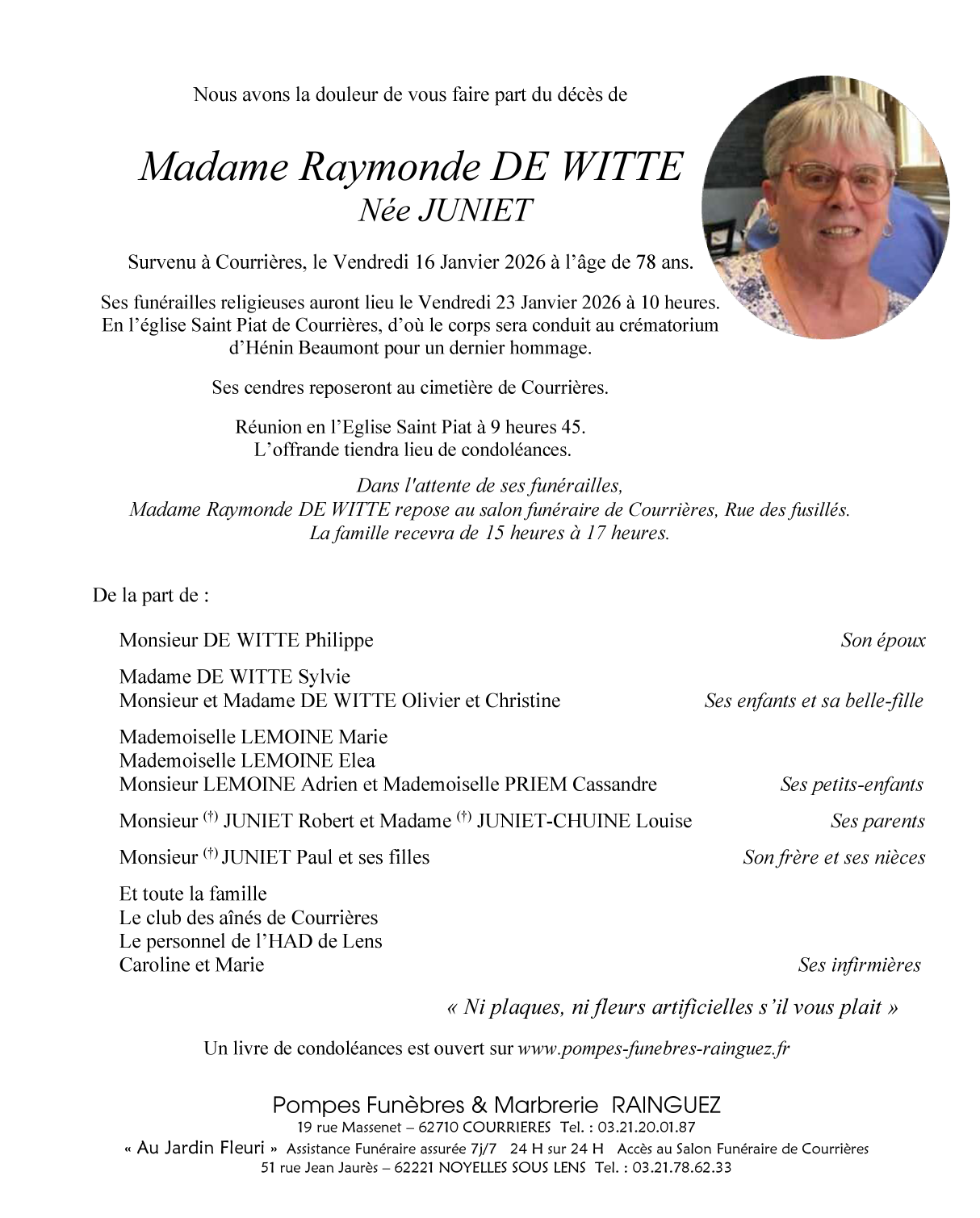 Décédée à Courrières (62710, France) le vendredi 16 janvier 2026 à l'âge de 78 ans