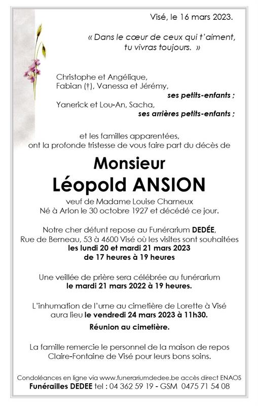 Fallecido en Visé (4600) el jueves, 16 de marzo de 2023 a la edad de 95 años
