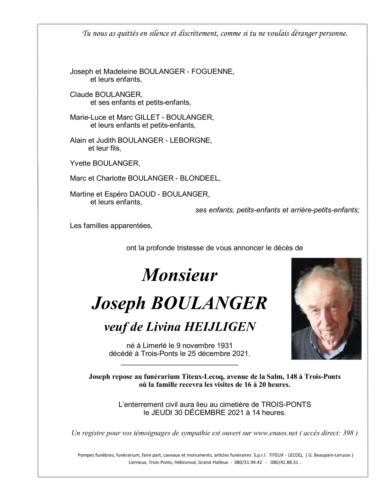 Fallecido en Trois-Ponts (4980) el sábado, 25 de diciembre de 2021 a la edad de 90 años