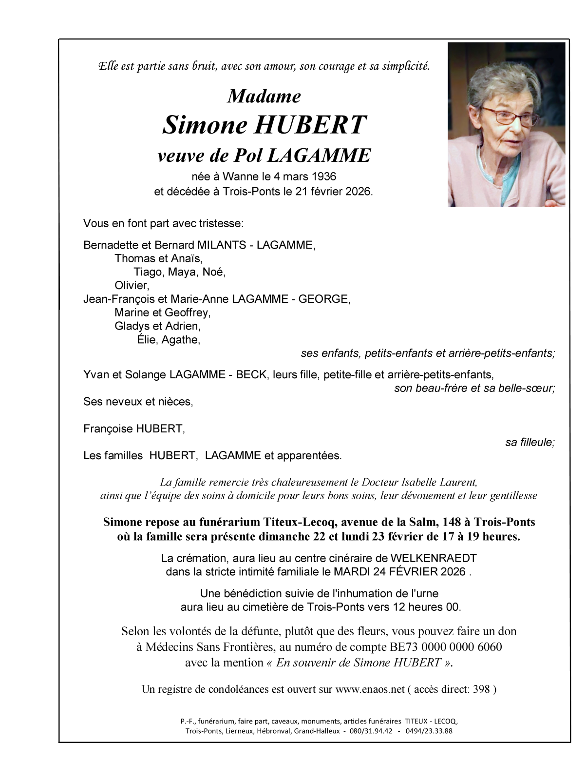 Overleden te Trois-Ponts (4980) op zaterdag 21 februari 2026 op 89-jarige leeftijd
