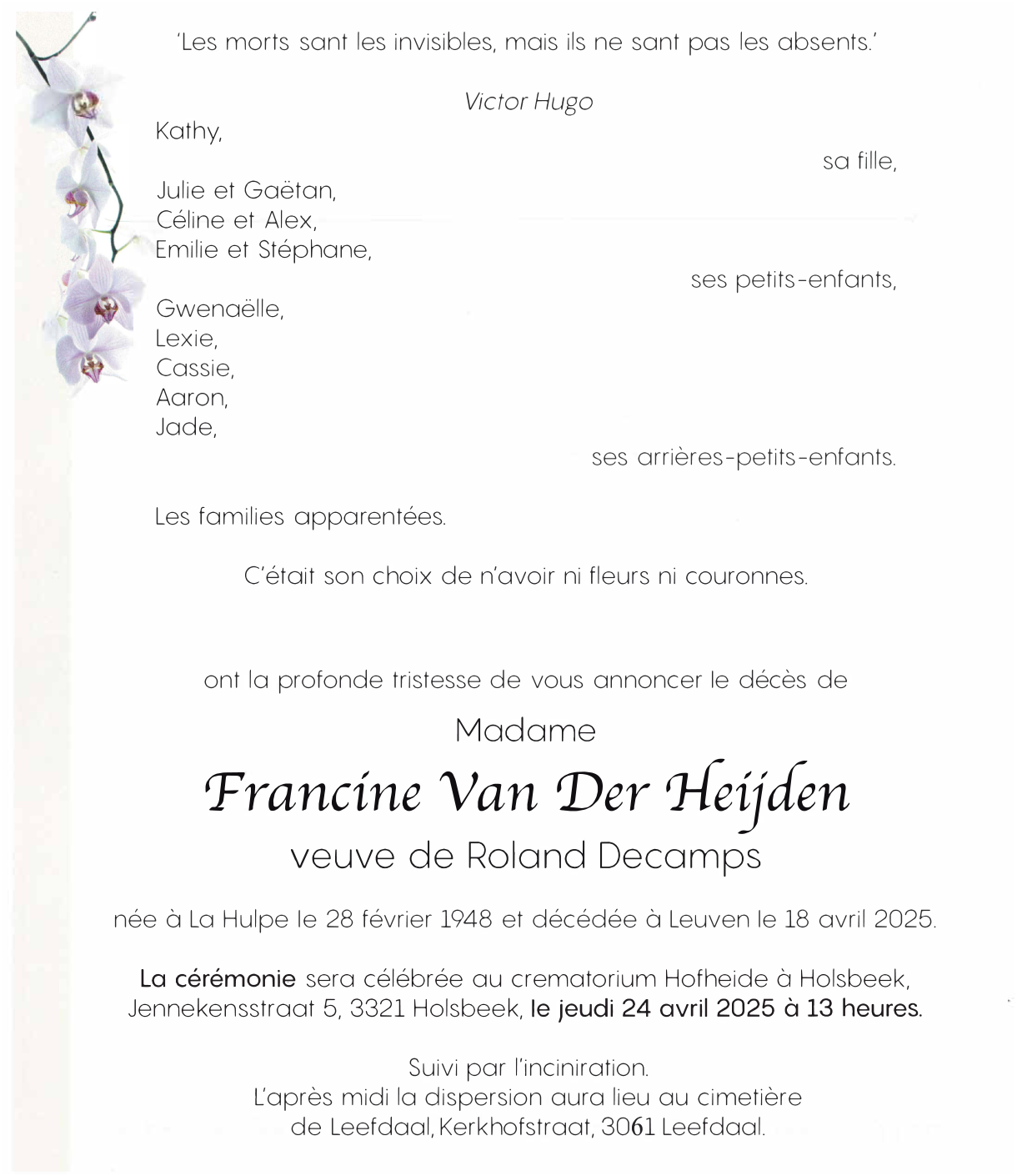 Décédée à Leuven (3000) le vendredi 18 avril 2025 à l'âge de 77 ans
