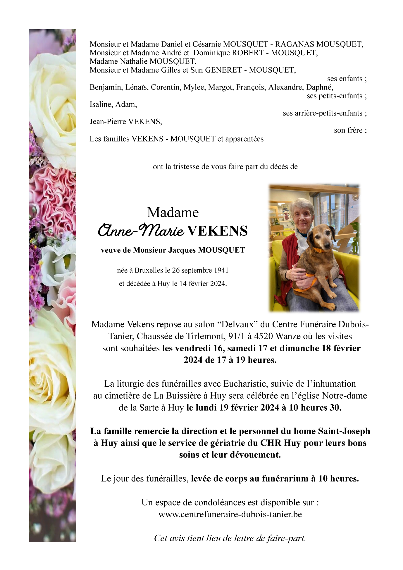 Décédée à Huy (4500) le mercredi 14 février 2024 à l'âge de 82 ans