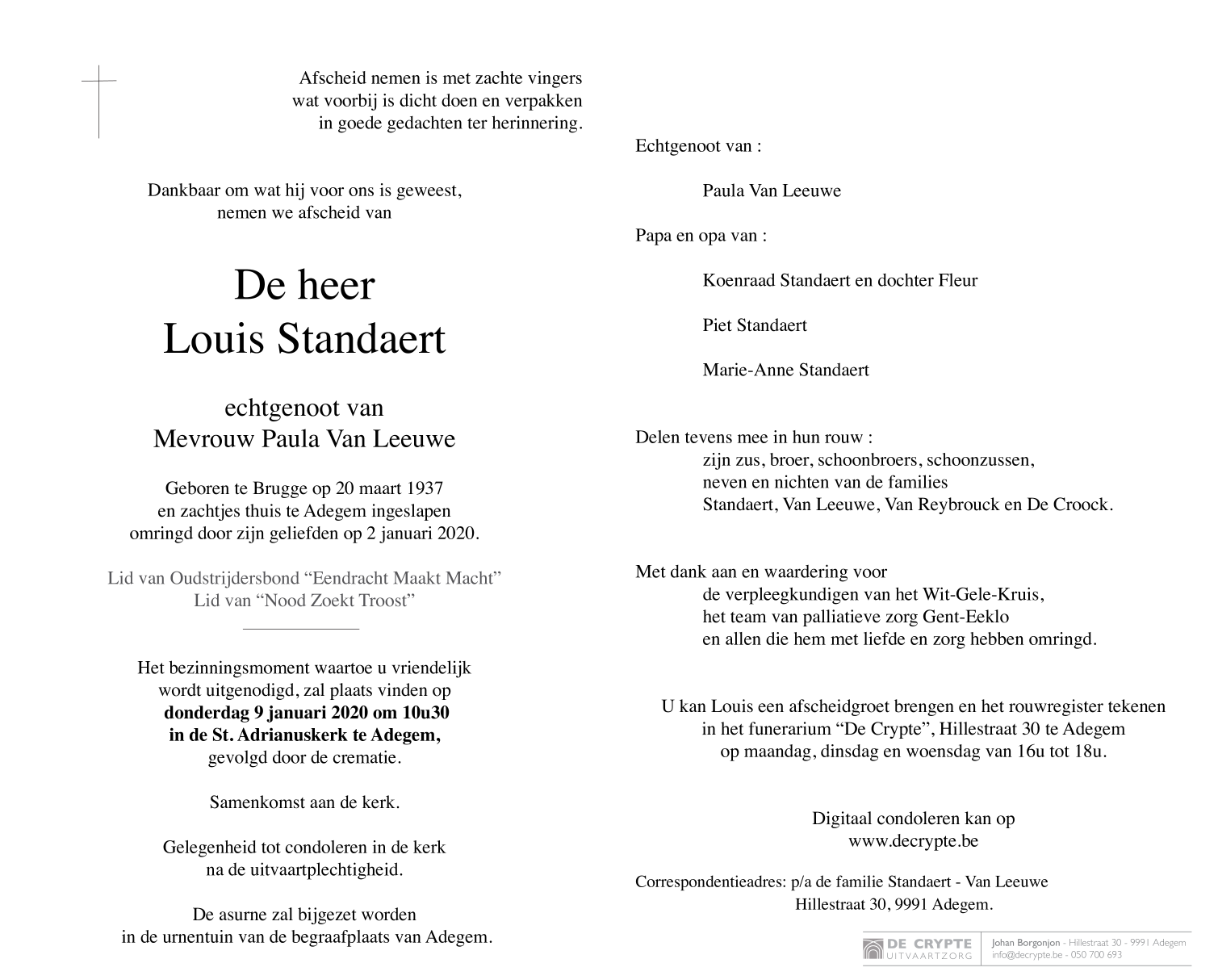 Died in Adegem (9991) on 02 January 2020 at the age of 82 years