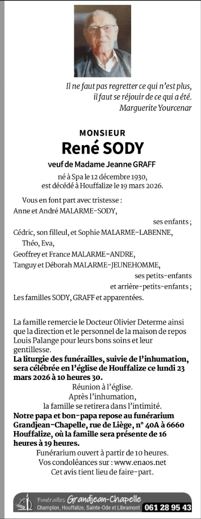 Décédé à Houffalize (6660) le jeudi 19 mars 2026 à l'âge de 95 ans