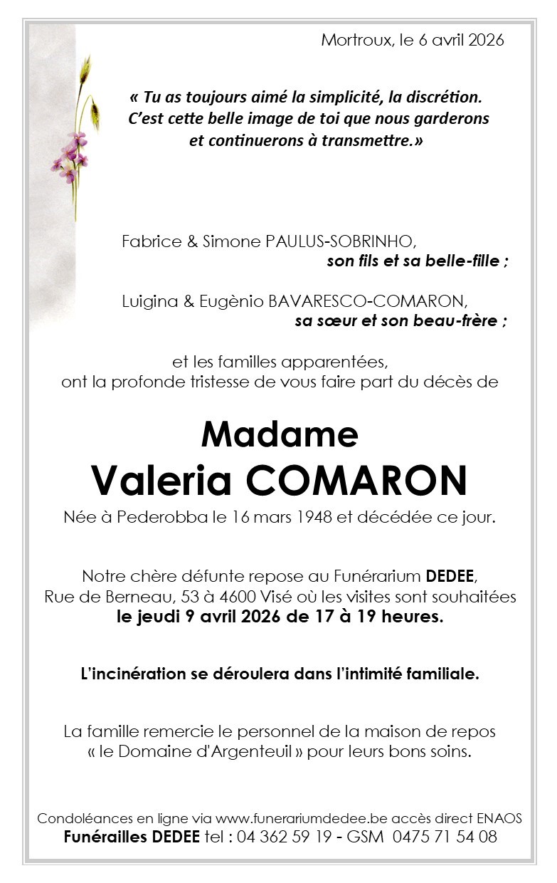 Décédée à Haccourt (4684) le lundi 6 avril 2026 à l'âge de 78 ans