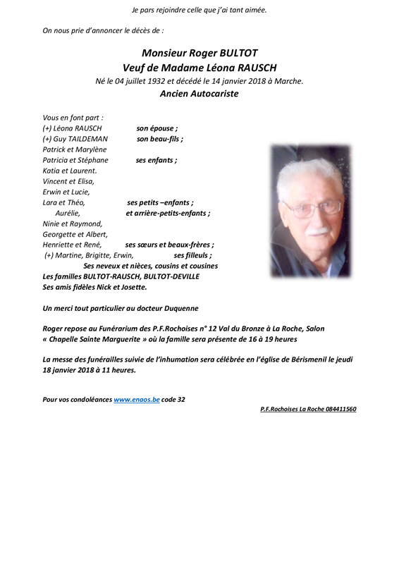 Died in Marche-en-Famenne (6900) on 14 January 2018 at the age of 85 years