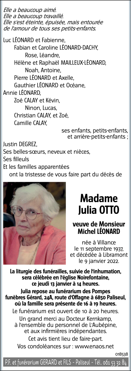 Overleden te Libramont (6800) op maandag 10 januari 2022 op 84-jarige leeftijd