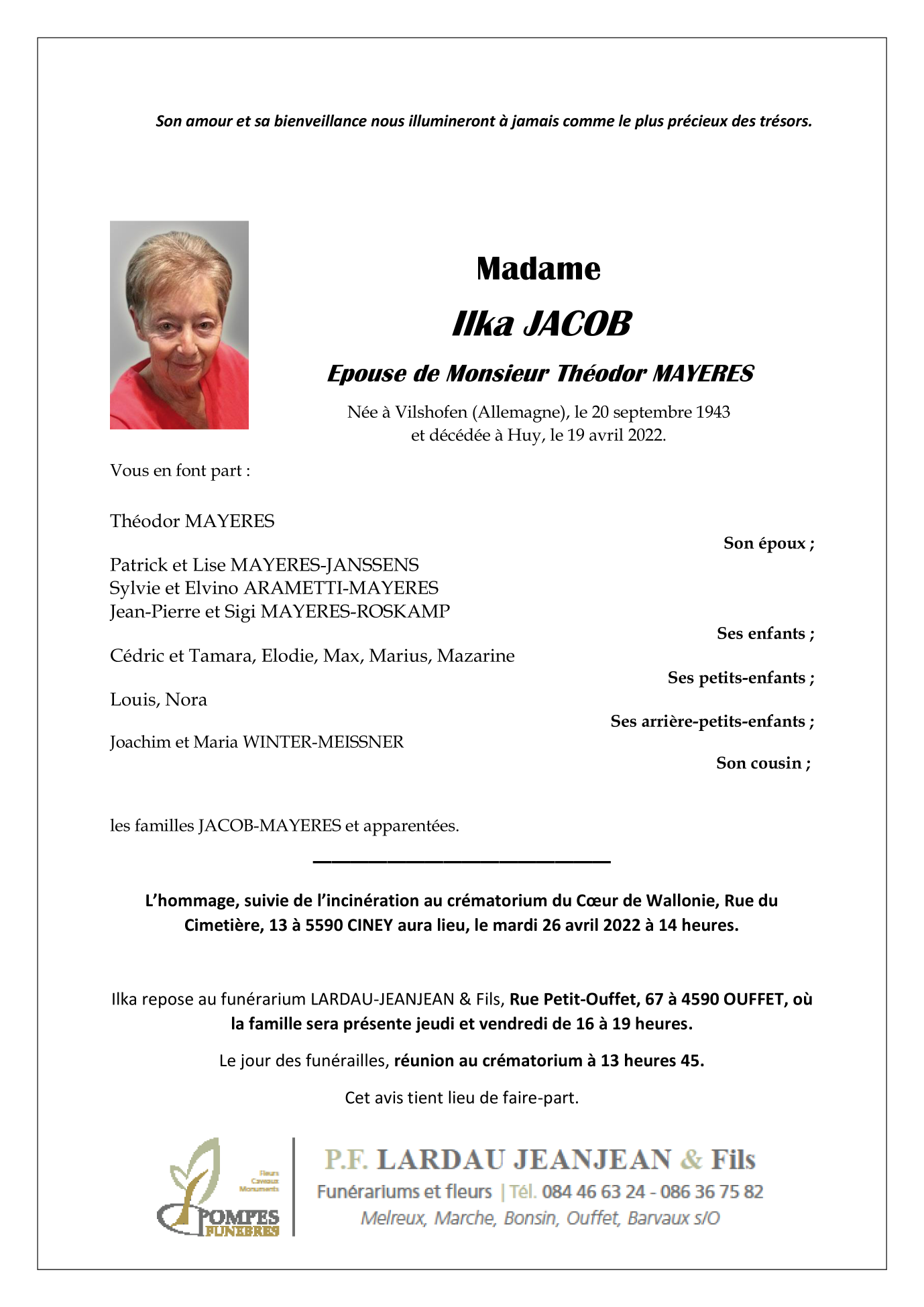 Fallecida en Huy (4500) el martes, 19 de abril de 2022 a la edad de 78 años