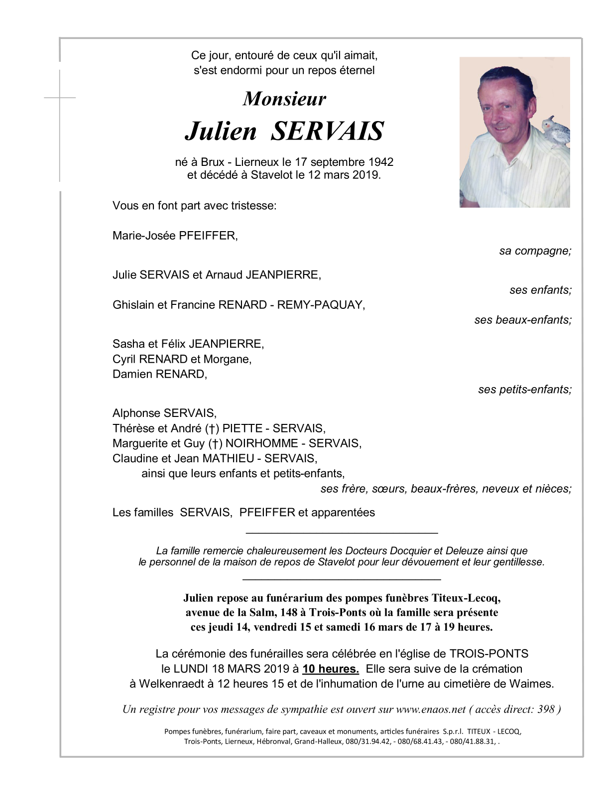 Fallecido en Stavelot (4970) el martes, 12 de marzo de 2019 a la edad de 76 años