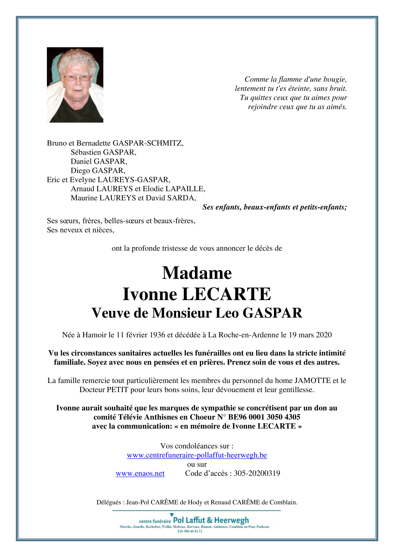 Overleden te La Roche-en-Ardenne (6980) op donderdag 19 maart 2020 op 84-jarige leeftijd