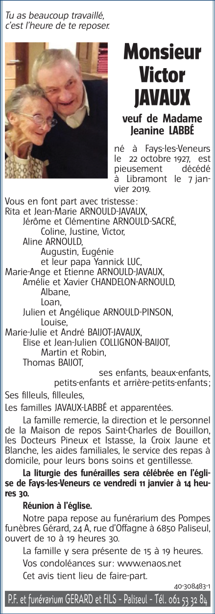 Décédé à Libramont (6800) le lundi 7 janvier 2019 à l'âge de 91 ans