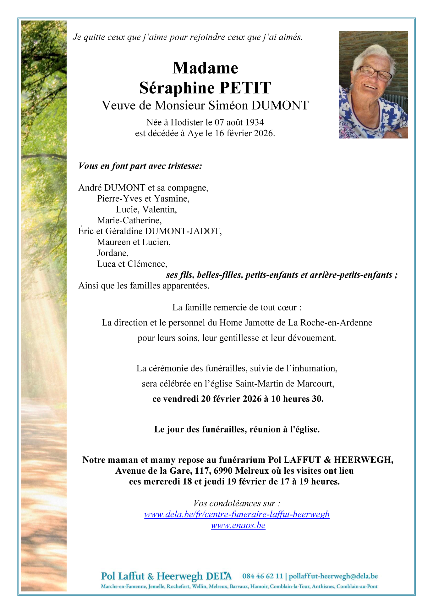 Décédée à Aye (6900) le lundi 16 février 2026 à l'âge de 91 ans