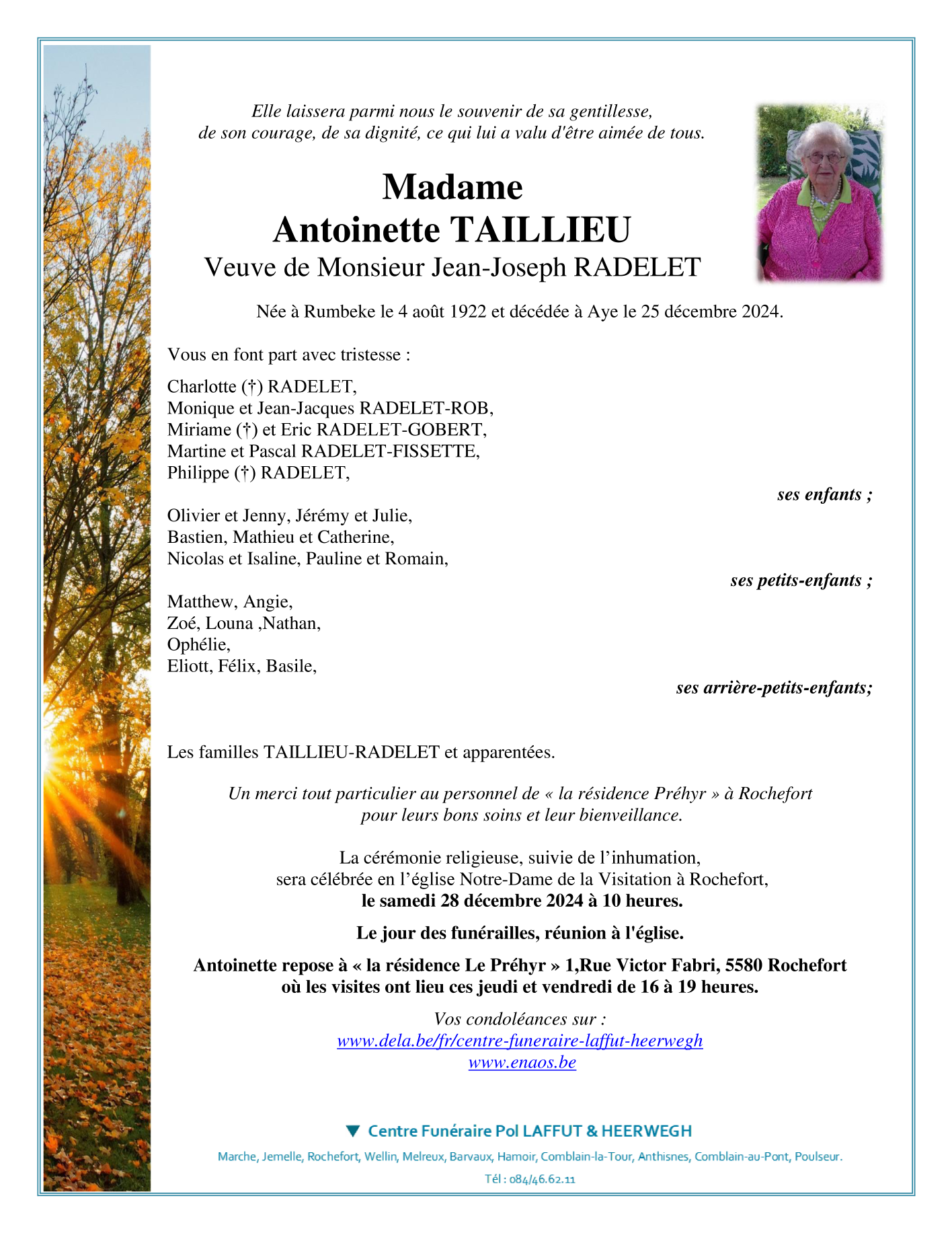 Overleden te Aye (6900) op woensdag 25 december 2024 op 102-jarige leeftijd
