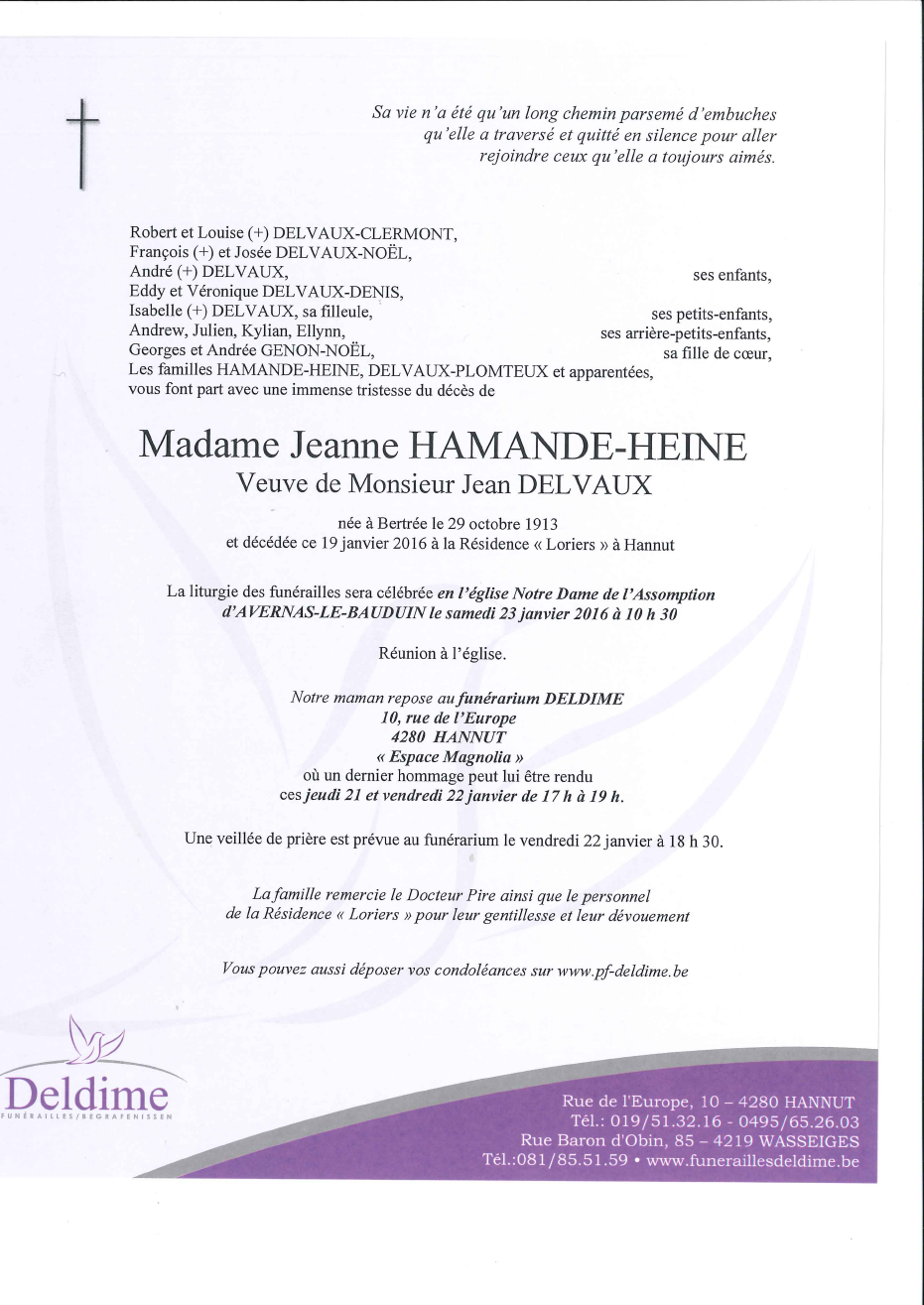 Décédée à Hannut (4280) le mardi 19 janvier 2016 à l'âge de 102 ans