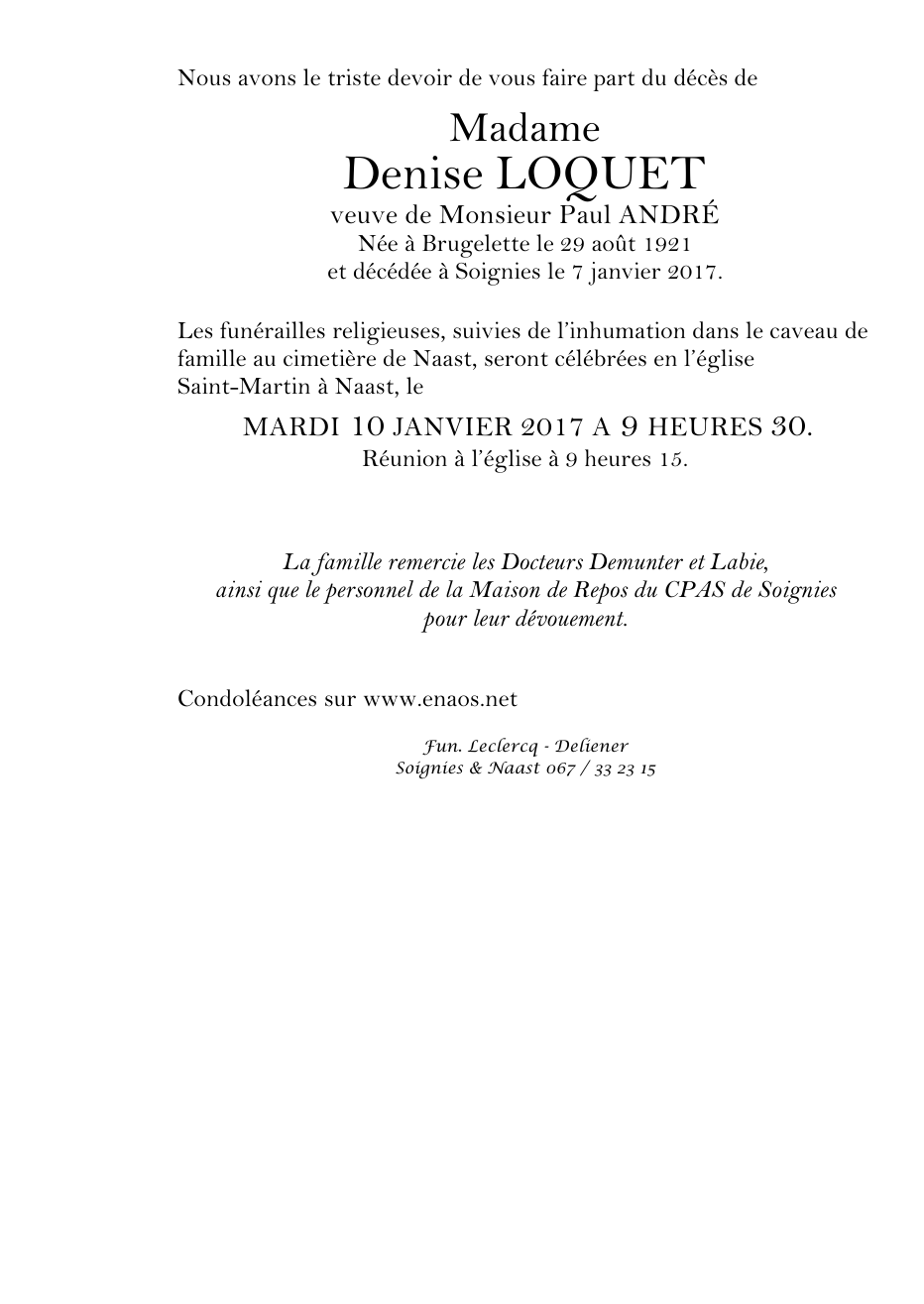 Décédée à Soignies (7060) le samedi 7 janvier 2017 à l'âge de 95 ans