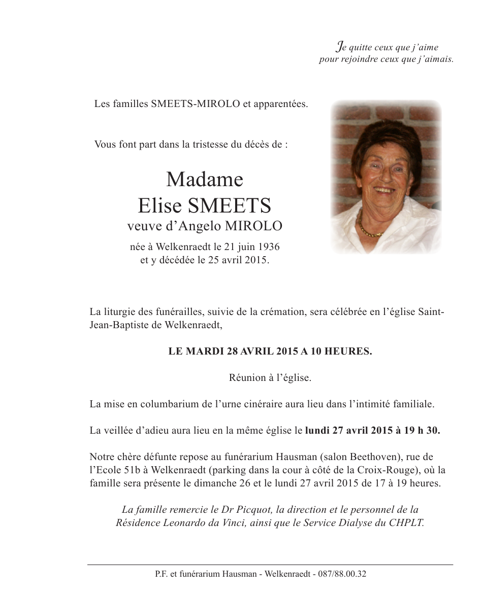 Décédée à Welkenraedt (4840) le samedi 25 avril 2015 à l'âge de 78 ans