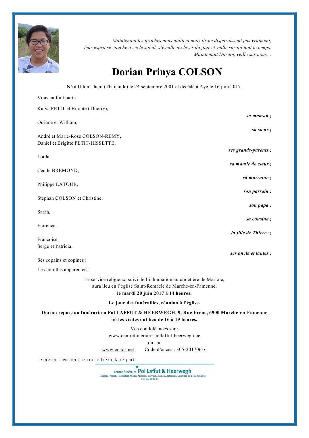 Décédé à Aye (6900) le vendredi 16 juin 2017 à l'âge de 15 ans