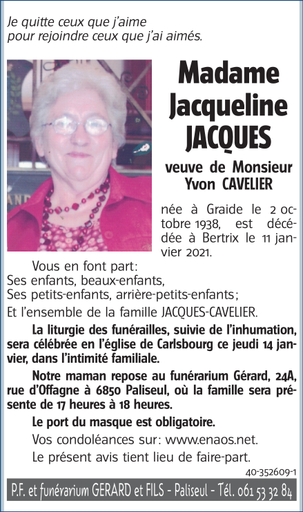 Died in Bertrix (6880) on 11 January 2021 at the age of 82 years
