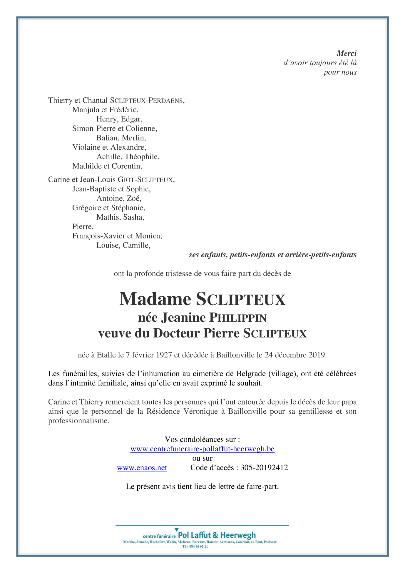 Died in Baillonville (5377) on 24 December 2019 at the age of 92 years