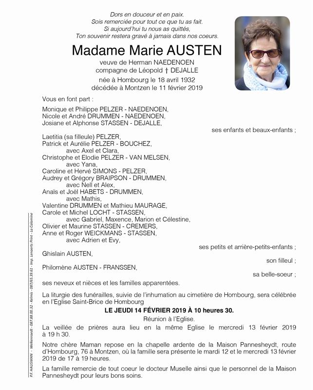 Décédée à Montzen (4850) le lundi 11 février 2019 à l'âge de 86 ans