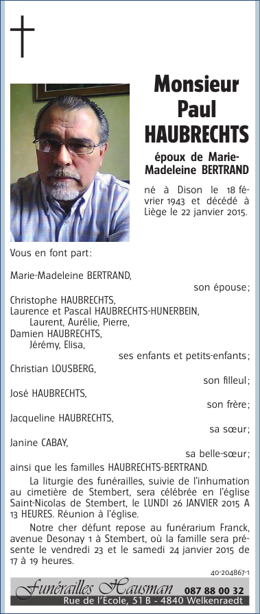 Décédé à Liège (4000) le jeudi 22 janvier 2015 à l'âge de 71 ans