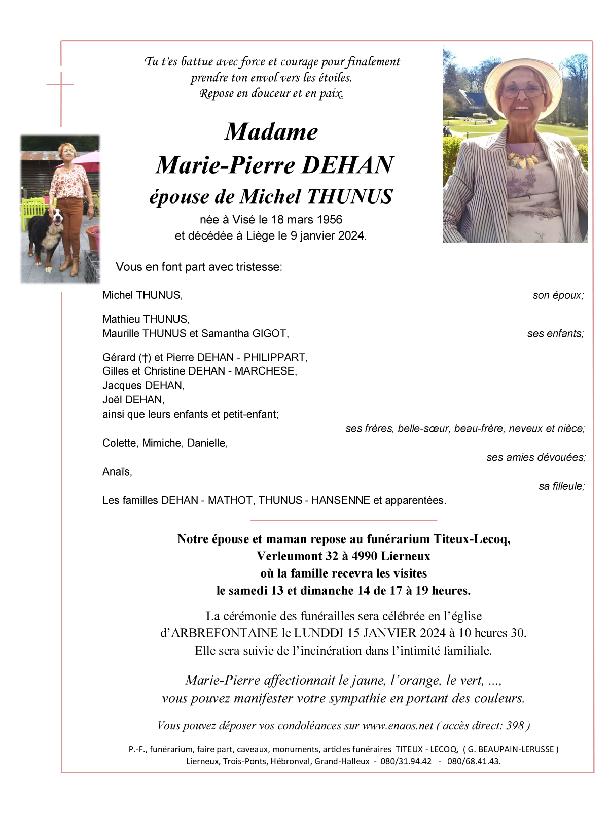 Fallecida en Liège (4000) el martes, 9 de enero de 2024 a la edad de 67 años
