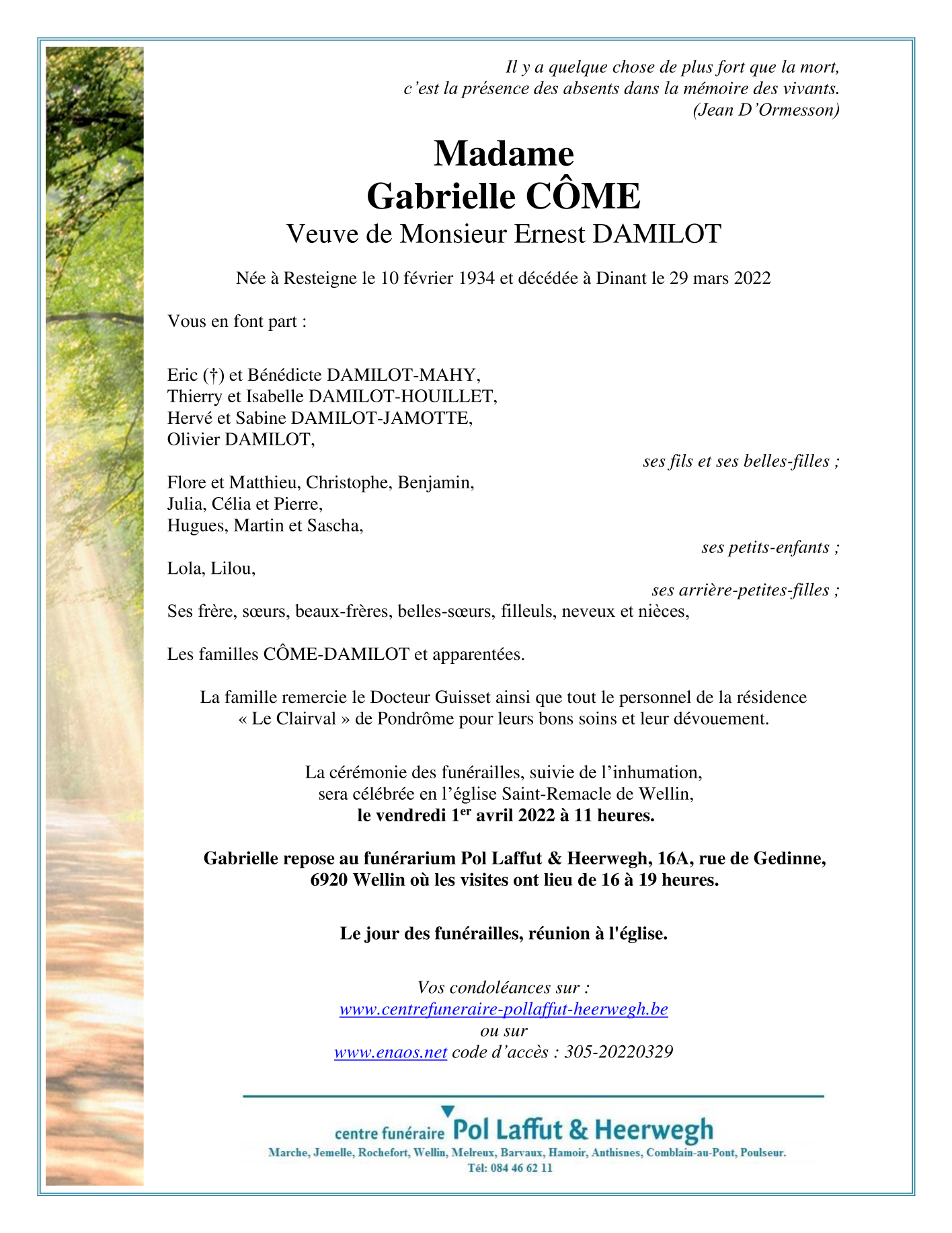Décédée à Dinant (5500) le mardi 29 mars 2022 à l'âge de 88 ans