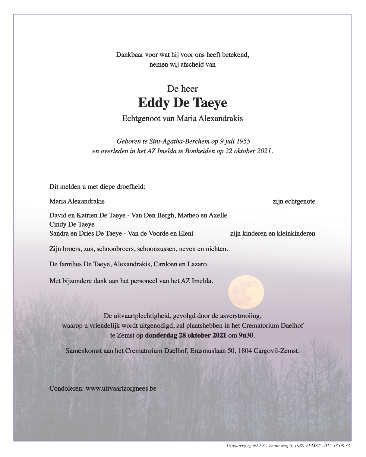 Fallecido en Bonheiden (2820) el viernes, 22 de octubre de 2021 a la edad de 66 años