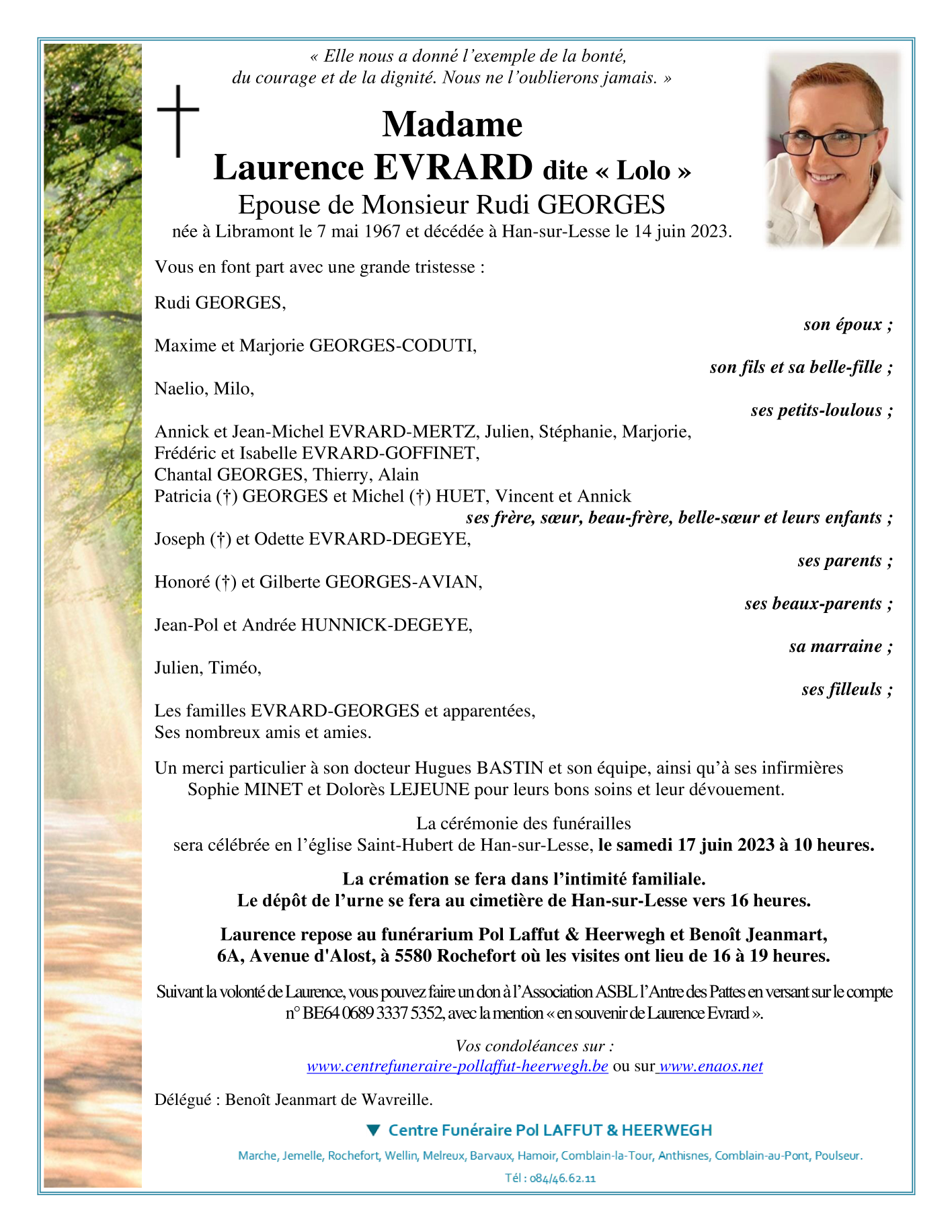 Décédée à Han-sur-Lesse (5580) le mercredi 14 juin 2023 à l'âge de 56 ans