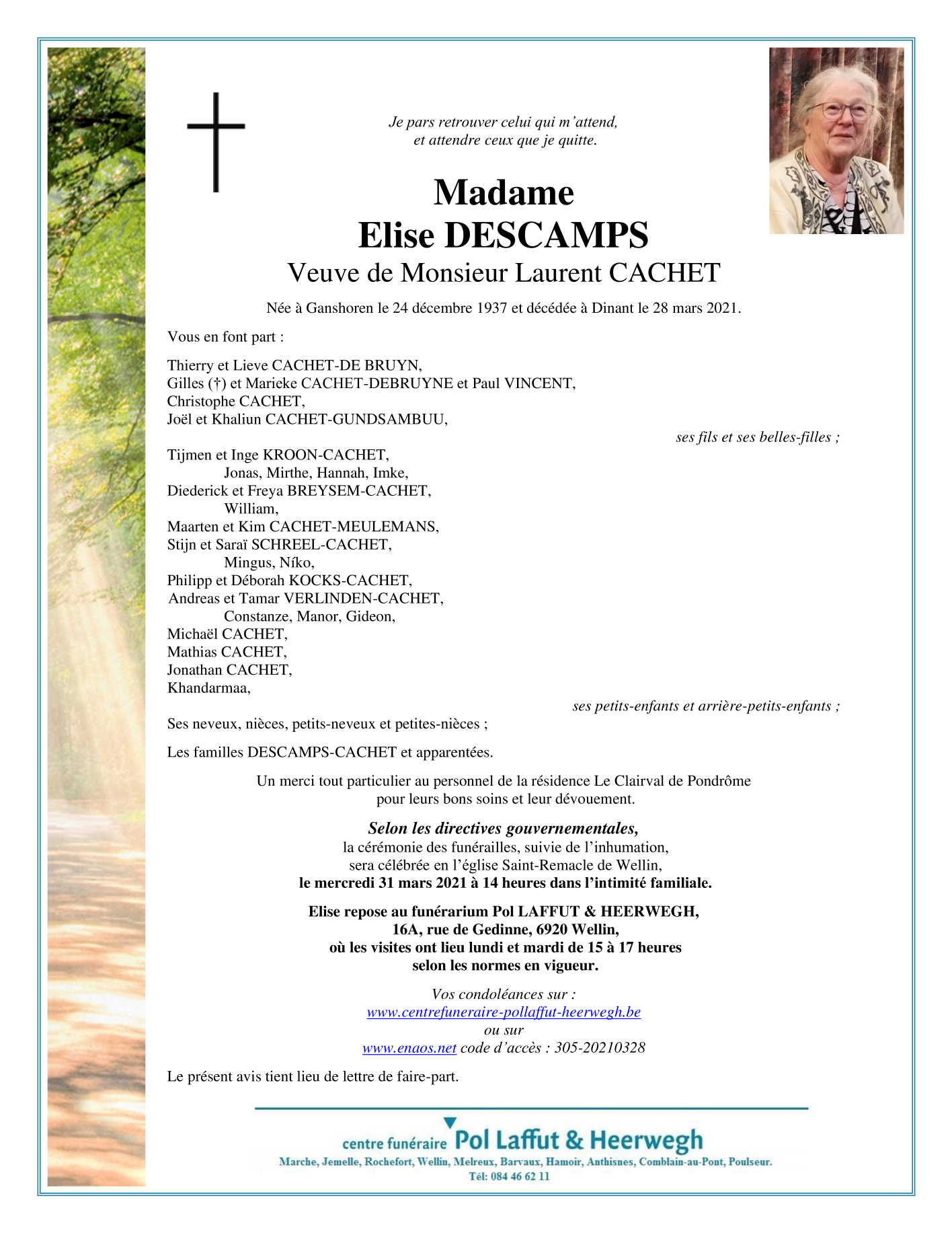 Décédée à Dinant (5500) le dimanche 28 mars 2021 à l'âge de 83 ans