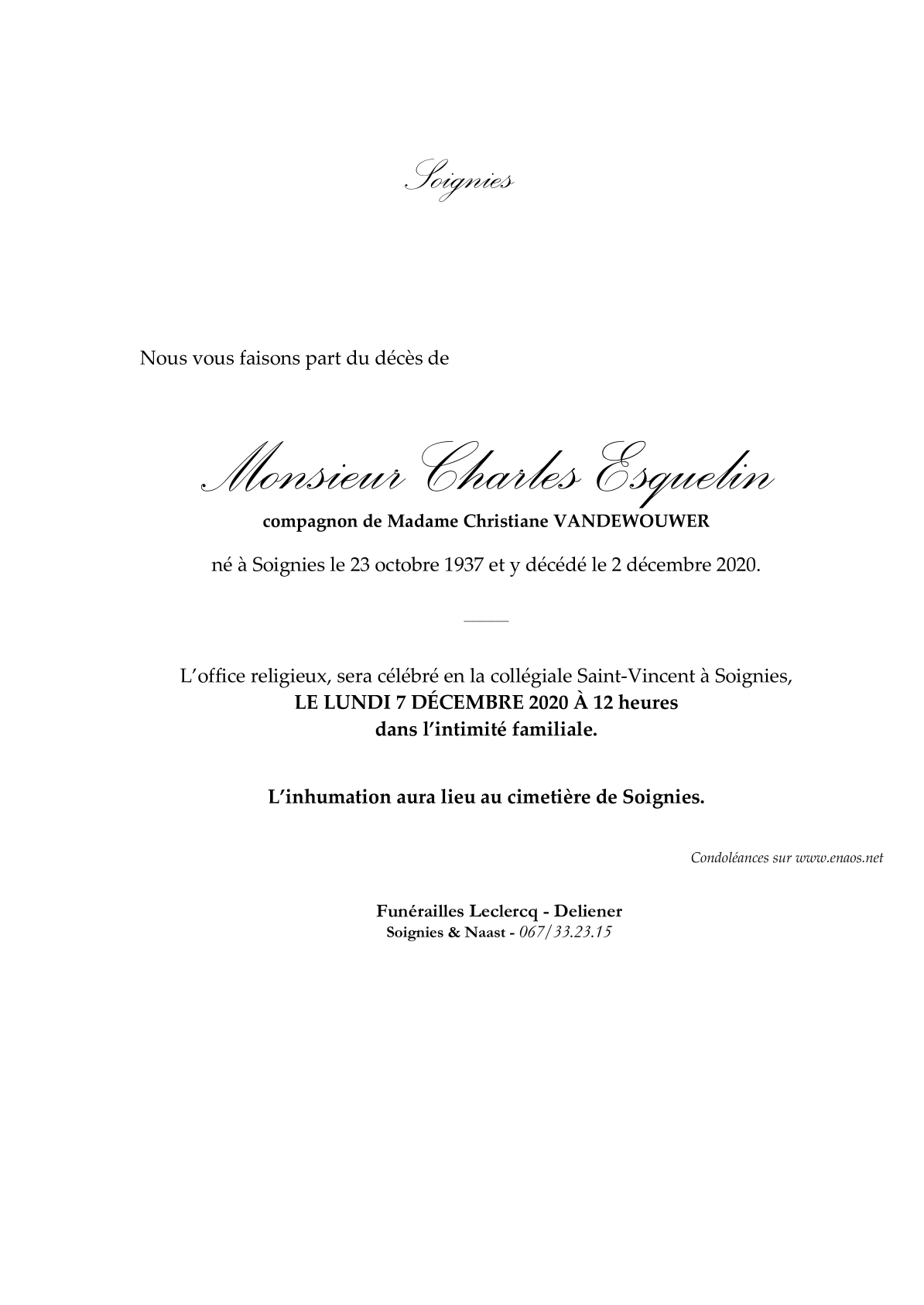 Died in Soignies (7060) on 02 December 2020 at the age of 83 years
