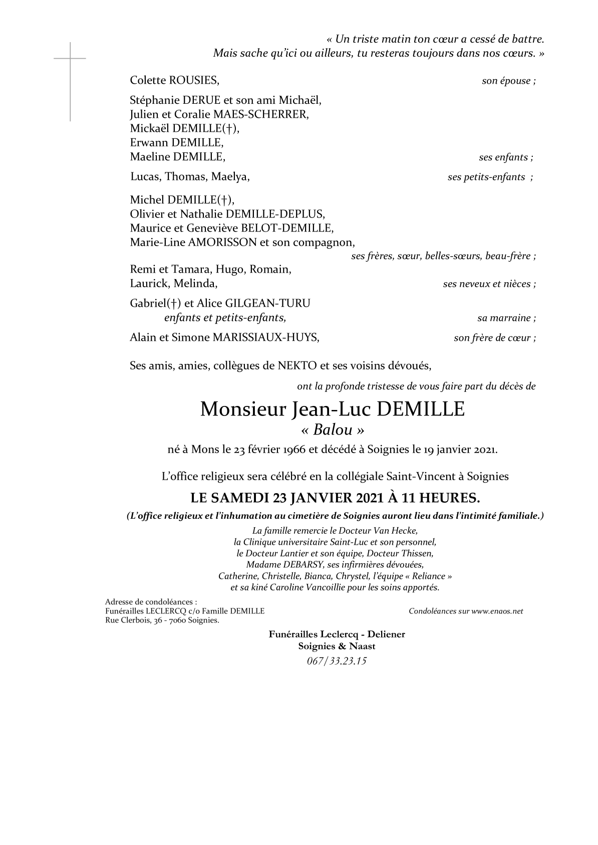 Fallecido en Soignies (7060) el martes, 19 de enero de 2021 a la edad de 54 años