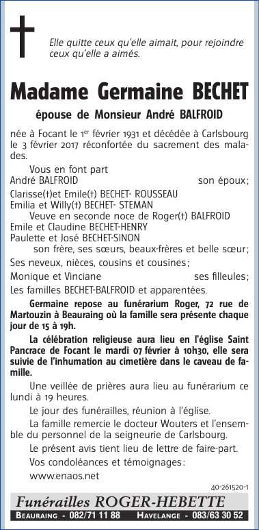 Died in Paliseul (6850) on 03 February 2017 at the age of 86 years