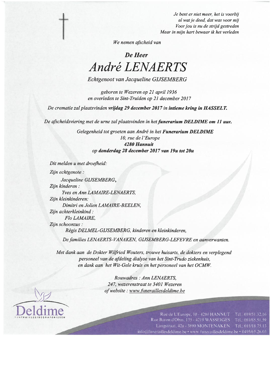 Décédé à Sint-Truiden (3800) le jeudi 21 décembre 2017 à l'âge de 81 ans