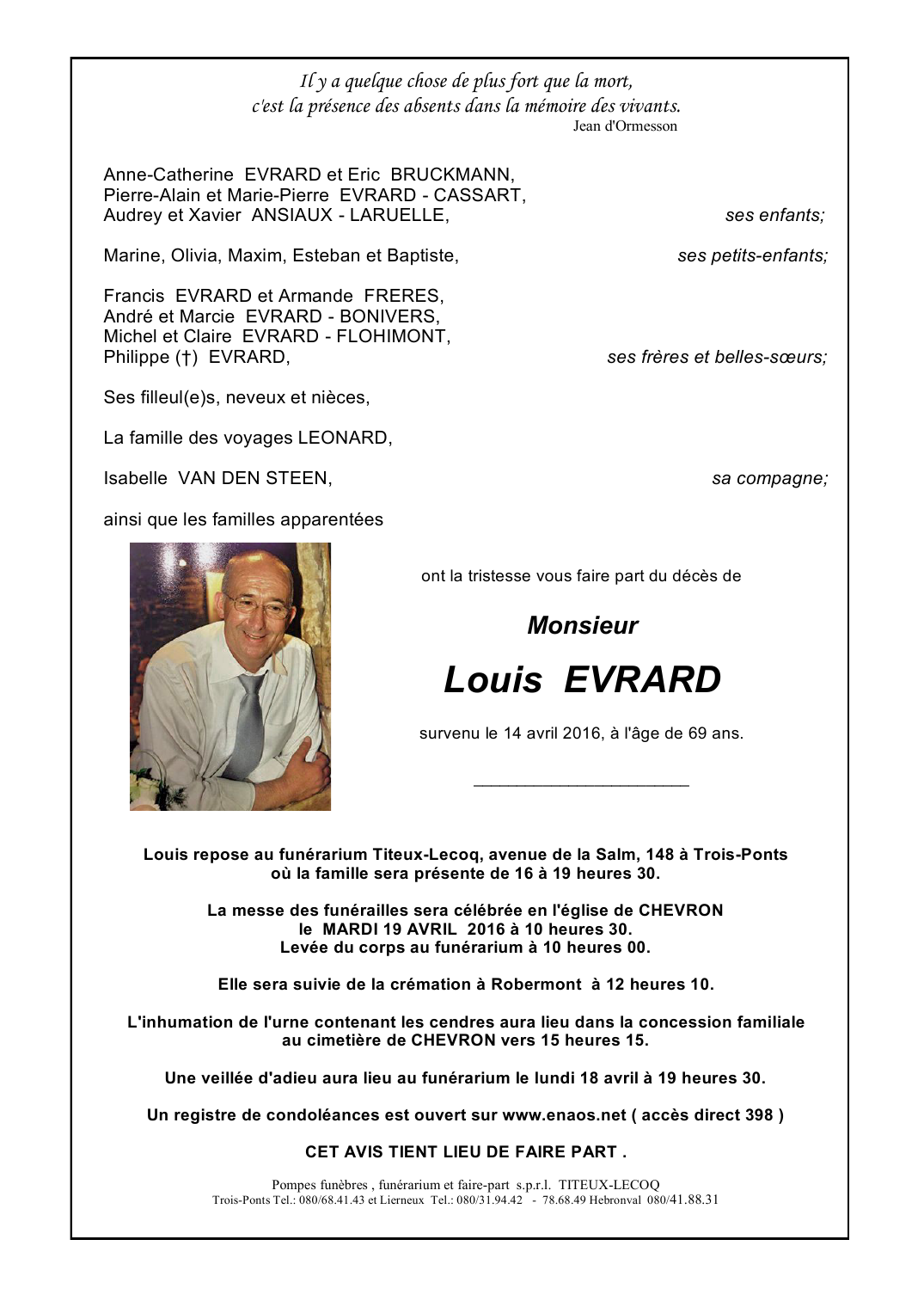 Died in Hermalle-sous-Argenteau (4681) on 14 April 2016 at the age of 69 years