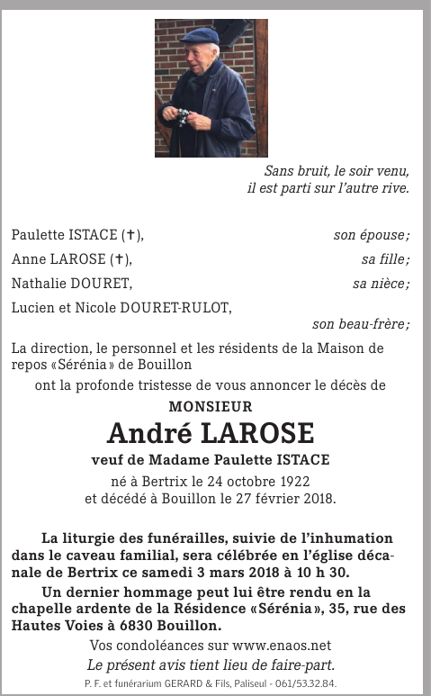 Fallecido en Bouillon (6830) el martes, 27 de febrero de 2018 a la edad de 95 años