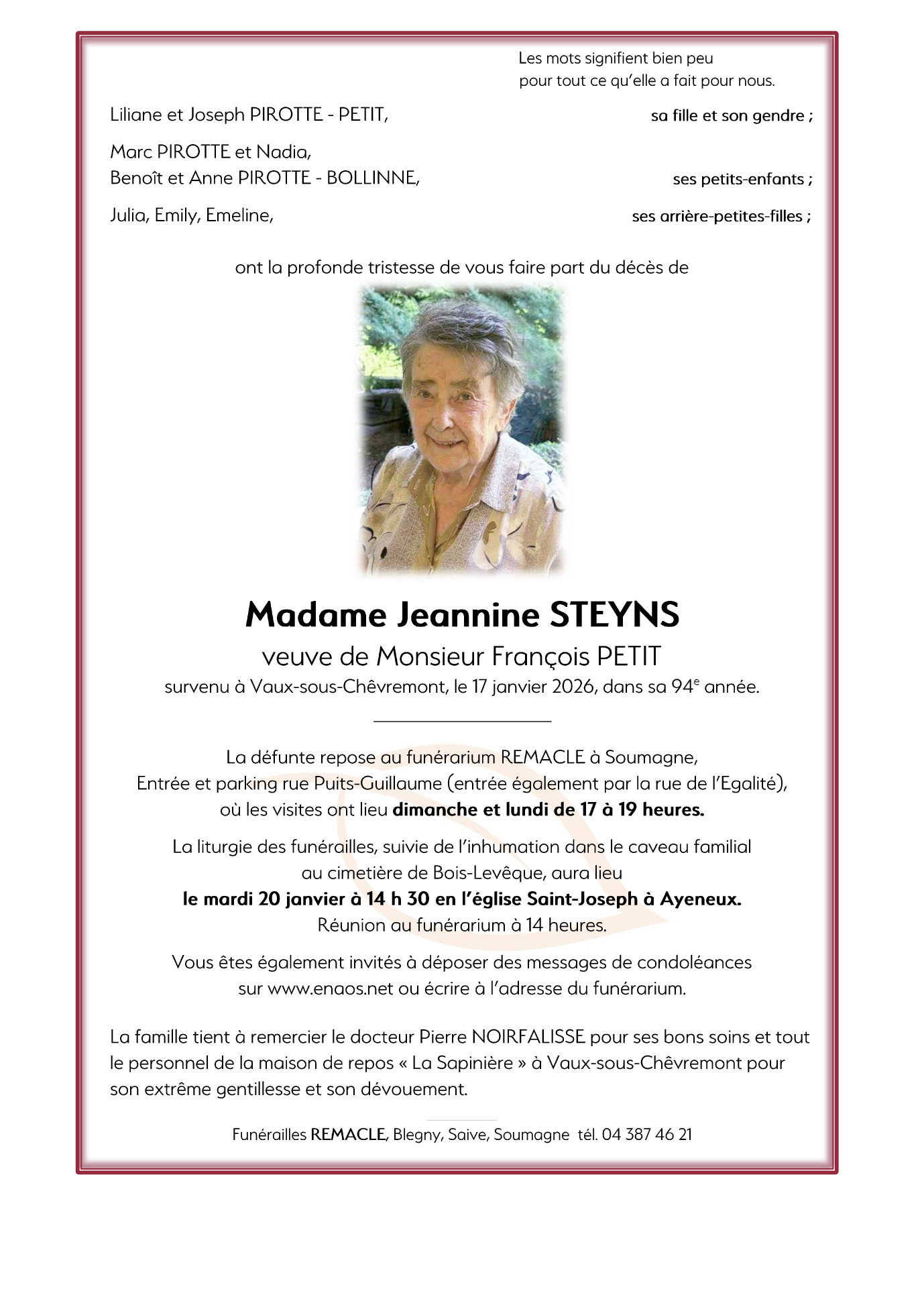 Décédée à Chaudfontaine (4051) le samedi 17 janvier 2026 à l'âge de 93 ans