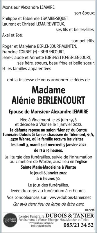 Décédée à Wanze (4520) le samedi 1 janvier 2022 à l'âge de 83 ans