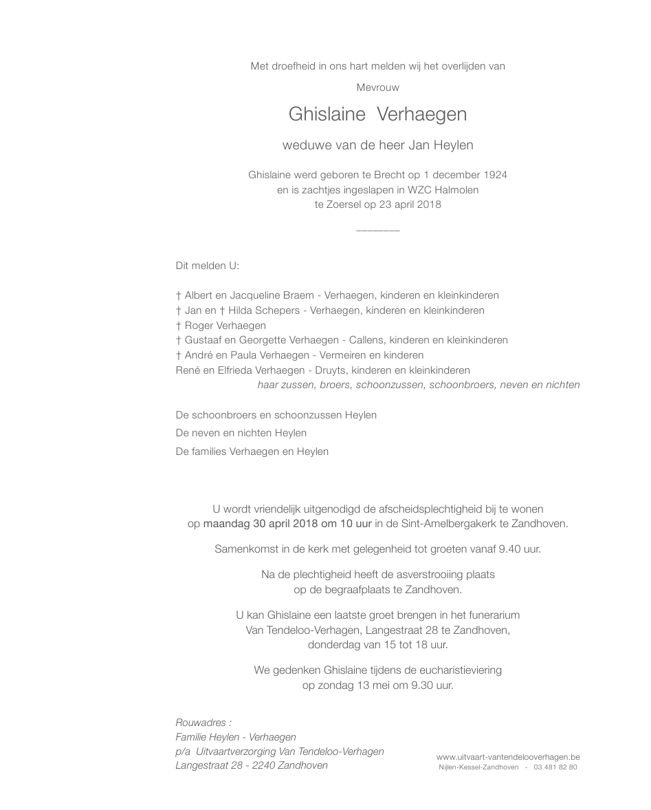 Fallecida en Zoersel (2980) el lunes, 23 de abril de 2018 a la edad de 93 años
