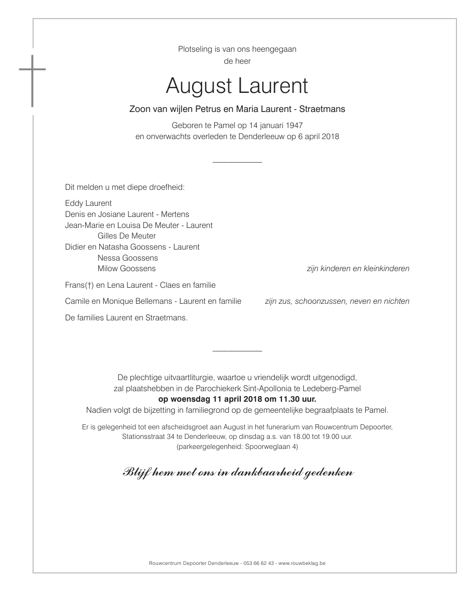 Décédé à Welle (9473) le vendredi 6 avril 2018 à l'âge de 71 ans