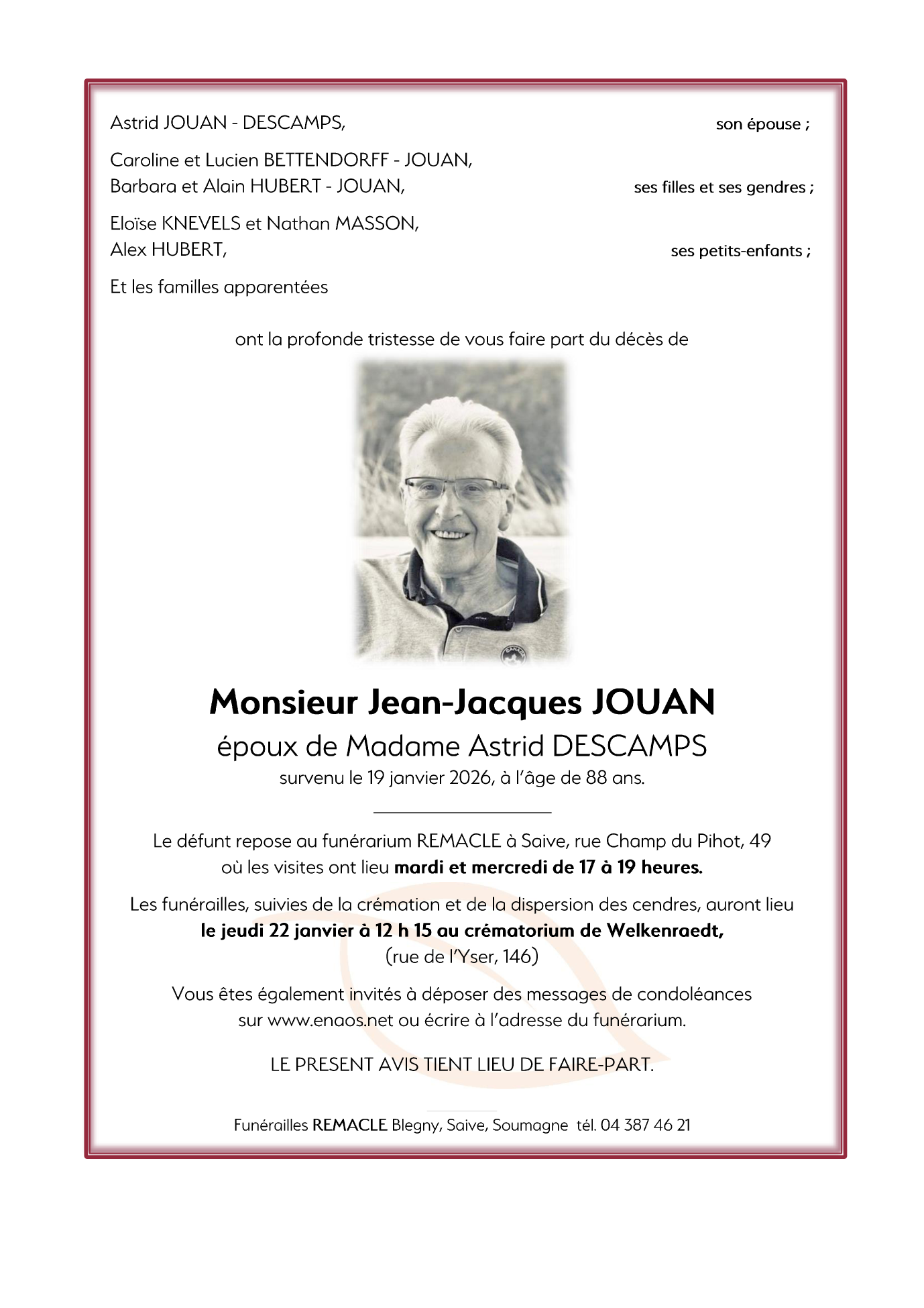 Décédé à Hermalle-sous-Argenteau (4681) le lundi 19 janvier 2026 à l'âge de 88 ans